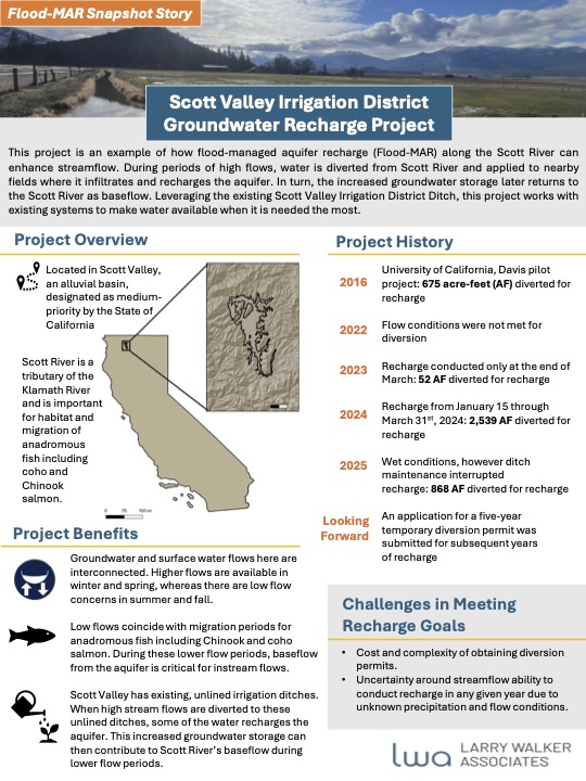 This two-page Flood-MAR Snapshot highlights the Scott Valley Irrigation District Groundwater Recharge Project, a real-world example of how high winter flows can be captured and recharged to support late-summer streamflows in the Scott River. The fact sheet summarizes project goals, recharge volumes from recent wet years, benefits for instream flows and salmon habitat, monitoring tools, and key challenges. It offers a clear, place-based illustration of how Flood-MAR can work in practice using existing irrigation infrastructure.